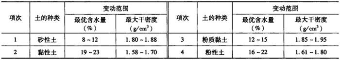从土的干密度与含水量的关系可以看出,曲线中有一峰值,此处的土料干密度最大。当压实功一定时,变化土的含水量至某一值,可使填土压实后获得某一最大干密度,图1-64土的干密度与含水量的关系这个含水量称为最佳含水量,相应的土料干密度称为最大干密度γ,只有在土中含水达到最佳含水量的情况下压实的土,水稳定性最好,土的密实度最大。 土在最佳含水量时的最大干密度,可由击实试验取得,也可查经验表确定,表1-25所列数据可供土方压实设计和施工时参考。 表1-25 土的最佳含水量与最大干密度