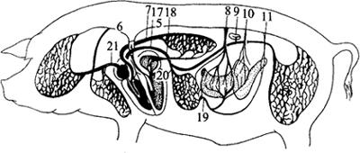 图1-13 血液循环模式图 1.右心室 2.左心室 3.右心房 4.左心房 5.主动脉 6.臂头动脉总干 7.肺动脉 8.腹腔动脉 9.肾动脉 10.肠系膜前动脉 11.肠系膜后动脉 12.头部毛细血管 13.前肢毛细血管 14.肺毛细血管 15.肝毛细血管 16.后肢毛细血管 17.后腔静脉 18.肺静脉 19.门静脉 20.肝静脉 21.前腔静脉 (3)血液 血管内流动的液体为血液,由液态的血浆和悬浮于血浆中的血细胞构成(表1-3)。血液中的水分、血浆蛋白以及红细胞内的血红蛋白起重要的运输气体、营养和激素的作用;血液中的白细胞对细菌和病毒有吞噬、杀灭作用;血液中的血小板在出血时参与血液凝固,对机体起保护作用。 表1-3 血液细胞构成
