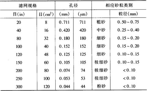 (2)滤网过滤器:滤网的孔径大小即网目数的多少要根据所用灌水器的类型及流道断面积大小而定。灌水器的堵塞主要与灌溉水中的污物颗粒形状及粒径大小有直接关系。因此微灌用灌溉水中所能允许的污物颗粒大小应比灌水器的口径或流道断面小许多,才能有效防止灌水器堵塞。根据实践经验,一般要求所选用的过滤器的滤网的孔径大小应为所使用的灌水器孔径大小的1/10~1/7。滤网规格与孔径对应关系见表8-42。 表8-42 滤网规格与孔径对应关系
