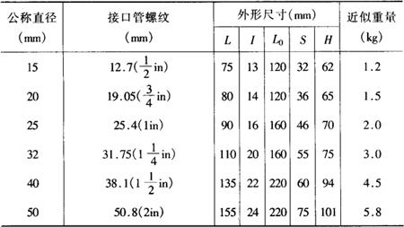 (2)截止阀:微灌机械中常用截止阀的规格尺寸见表8-45和表8-46。 表8-45 J11型内螺纹直通式截止阀规格