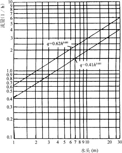 (2)管式滴头:管式滴头的流量-水头曲线(q-h曲线)见图8-57。