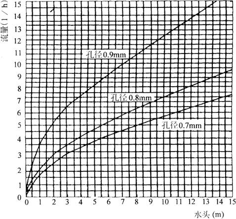 图8-57 管式滴头的q-h曲线 (3)孔口滴头:孔口滴头的流量计算公式为 q=3.1h0.5 式中:q——滴头流量(L/h); h——工作水头(m)。 孔口滴头的水流态为紊流,在同样的压力变化条件下,孔口滴头的流量变化率比微管和管式滴头要小。 (4)膜片式多孔毛管:膜片式多孔毛管的流量水头曲线(q-h曲线)见图8-58。