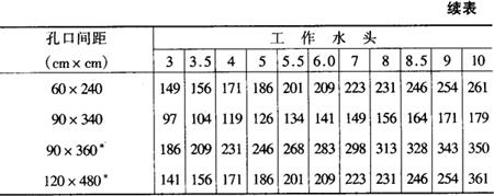*又叫树行毛管。 (6)微喷头:微喷头的主要技术参数有工作水头(扬程)、流量、射程、喷水强度(参见喷灌机械技术参数一部分)和湿润面积等。 折射式喷水头的水力性能见表8-56。射流旋转式微喷头的水力性能见表8-57。 表8-56 折射微喷头水力性能