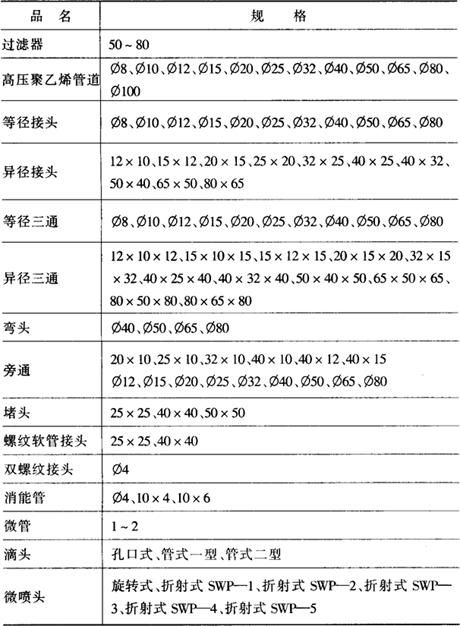 (二)微灌机械各组成部件的配套规格 为便于用户使用和微灌工程设计需要,常用的微灌设备、管道和连接件规格见表8-58。 表8-58 常用的微灌设备、管道和连接件规格(单位:mm)