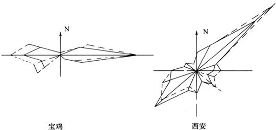 图4-1-2 风向玫瑰图示例 另一种风速玫瑰图是表示各方向平均风速大小的玫瑰图形。其画法与风向玫瑰图大致相同。要注意,主导风向和主导风速两者往往并不在同一个方向上,因此为了综合判断它们二者对环境的影响,就提出了一个污染系数的概念,它的表示式如下: