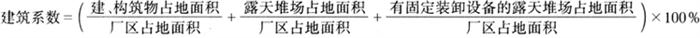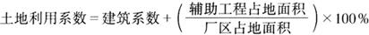 (4)道路总长度 按厂区内可通行汽车的车行道中心计算(包括回车场、车间行道,计算时扣除与道路中心重合部分)。 (5)土地利用系数 指建筑系数与辅助工程占地面积之和与厂区占地面积之比。辅助工程:铁路、道路、人行道、地上、地下工程管线、散水坡、绿化等。