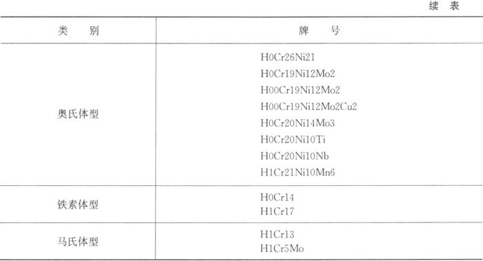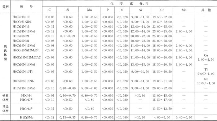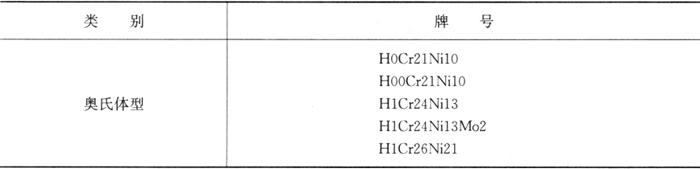注:①根据要求,H0Cr21Ni10、H00Cr21Ni10和H0Cr20Ni10Nb中的含铬量可规定如下:Cr≥1.9×Ni%。 ②H1Cr17允许含Ni<0.60%;H1Cr13允许含Ni<0.60%、Mo<0.60%。 与GB/T 983-1995《不锈钢焊条》标准不同,不锈钢焊丝标准仍用元素的大致成分范围来表示焊丝的牌号,而不采用焊条型号的表示方法,所以与AWS对焊丝类别的表示方法也不同。 此外在本标准中还列入H1Cr5Mo焊丝,如上所述,该焊丝在低合金钢焊丝中加以阐述。 本标准中的焊丝可用于气体保护焊,也可用于埋弧自动焊或其他焊接方法中。 |