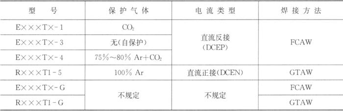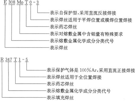 注:FCAW为药芯焊丝电弧焊.GTAW为钨极惰性气体保护焊 焊丝型号举例如下: