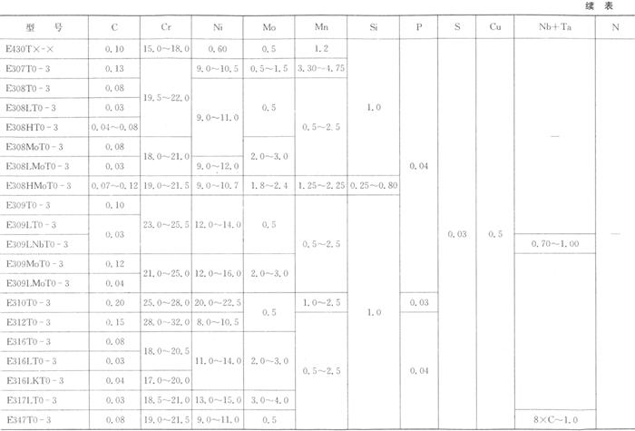不同型号的焊丝均要求进行熔敷金属化学分析,焊缝射线探伤试验和熔敷金属拉伸试验。对E3××T×-×型号还要求进行焊接接头纵向正弯试验,对R×××T1-5则要求进行接头纵向背弯试验,E316LKT0-3型焊丝的熔敷金属冲击试验由供需双方协商定。 熔敷金属化学成分应符合表3.4-2规定。焊缝射线探伤应符合GB/T 3323中Ⅱ级规定。熔敷金属拉伸性能应符合表3.4-3规定。焊接接头纵向正弯或背弯试样经弯曲后,在焊缝上不应有大于3mm的裂纹等缺陷。 表3.4-2 熔敷金属化学成分(GB/T 17853-1999)
