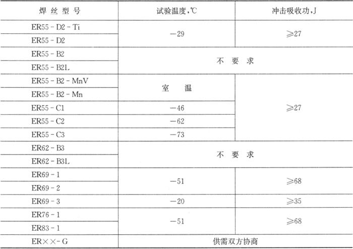 焊丝的化学成分应符合表2.3-1的规定,熔敷金属拉伸试验结果应符合表2.3-2的规定,熔敷金属夏比V型缺口冲击试验结果应符合表2.3-3的规定。在表2.3-2中同时列出了低合金钢焊丝在焊接时所采用的保护气体以及在试验时的热处理状态。 表2.3-1 低合金钢气体保护焊焊丝化学成分(GB/T 8110-1995)