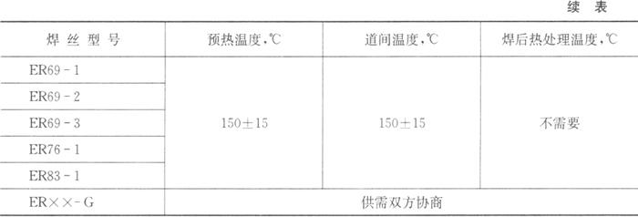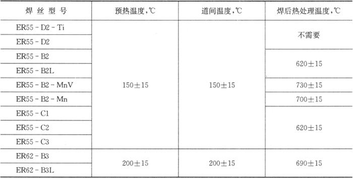 GB/T 14958标准适用于低碳钢、低合金钢和合金钢气体保护焊冷拉钢丝。此标准中的焊丝型号分类不同于GB/T 8110,其焊丝型号编制方法如下:字母“H”表示焊丝;H后面的两位数字表示碳的含量;后面的字母和数字表示焊丝中所含的化学元素和含量。标准中的H08MnSi、H08Mn2Si、H08Mn2SiA为规定正式使用的钢丝牌号。H11MnSi、H11Mn2SiA为推荐使用的钢丝牌号,用户可视需要选用。 由于本章仅涉及低合金钢焊丝和填充丝,故在表2.3-1、表2.3-2和表2.3-3中仅取用了GB/T 8110-1995标准中的低合金钢焊丝部分,碳钢部分(包括ER49-1至ER50-7)在第1章中已有论述,故在本章中不再重复。低合金钢焊接时的预热和道间温度以及焊后热处理温度列于表2.3-4。 表2.3-4 预热、道间和焊后热处理温度(GB/T 8110-1995)