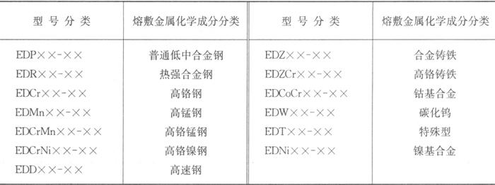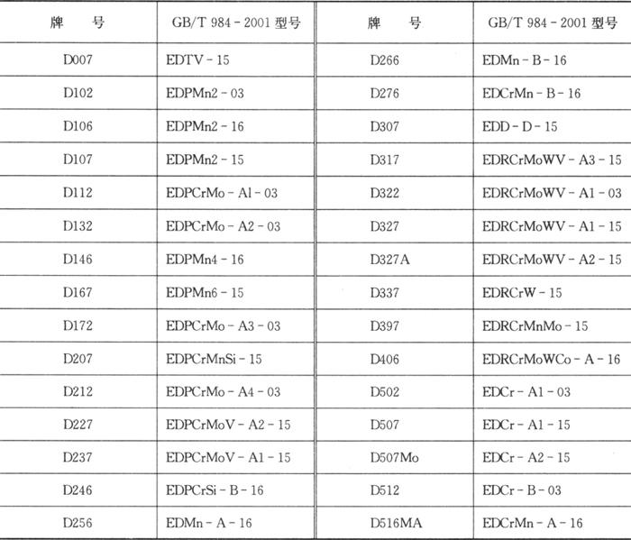 注:1.若存在其他元素,也应进行分析,以确定是否符合“其他元素总量”一栏的规定。 2.化学成分的单值均为最大值。硬度的单值均为最小平均值。 3.为经热处理的硬度值,热处理规范在说明书中规定。 对化学分析(焊条Φ3.2、Φ4.0、Φ5.0)试验,取样位置距试板上表面最小距离应为16mm。对硬度试验,试件应以平焊位置施焊,试件应至少堆焊4层,每道焊缝宽度不应大于焊条直径的4倍。堆焊时每焊完一道,应冷却至(100±10)℃再开始焊下一道焊缝。 在GB/T 984-2001标准中,堆焊焊条共分为14个类型80个型号,其中EDP型有17个型号,EDR型有7个型号,EDCr型有3个型号,EDMn型有6个型号,EDCrMn型有4个型号,EDCrNi型有3个型号,EDD型有5个型号,EDZ型有10个型号,EDZCr型有12个型号,EDCoCr型有5个型号,EDW型有2个型号,EDTV型有1个型号,EDNi型有2个型号,加上EDGWC型碳化钨管状堆焊焊条还有3个型号(每个型号有5个不同的碳化钨颗粒度)。 在标准的附录A中,简要地介绍了上述14个类型堆焊焊条的性能及其用途,下面还将对这些焊条的应用进行详细讨论。 国内生产的堆焊焊条有时还用牌号来表示,牌号的开头为英文大写字母D,表示堆焊焊条,后面跟3个阿拉伯数字如D327、D802等,3位数的末位数代表药皮类型,其中2为钛钙型,6为低氢钾型,7为低氢钠型,8为石墨型。按1997年机械工业部编制的《焊接材料产品样本》中堆焊焊条牌号规定,根据“主要用途”来划分,堆焊焊条共分九大类: D00×-09× 不规定 D10×-24× 不同硬度常温堆焊焊条 D25×-29× 常温高锰钢堆焊焊条 D30×-49× 刀具工具堆焊焊条 D50×-59× 阀门堆焊焊条 D60×-69× 合金铸铁堆焊焊条 D70×-79× 碳化钨堆焊焊条 D80×-89× 钴基合金堆焊焊条 D90×-99× 待发展堆焊焊条 表4.2-6为部分堆焊焊条牌号与相应型号的对照表。 表4.2-6 部分堆焊焊条牌号与GB/T 984-2001型号对照