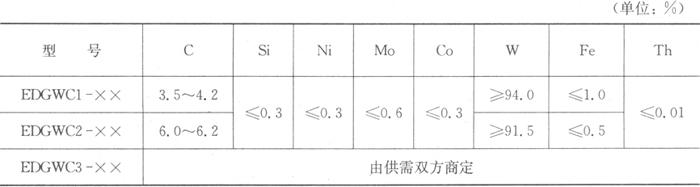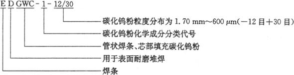注:1.焊条型号中的“×”代表“1”或“2”或“3”,表示不同的碳化钨颗类型。 2.允许通过(“-”)筛网的筛上物≤5%,不通过(“+”)筛网的筛下物≤20%。 芯部碳化钨粉WC1和WC2的质量分数应为(