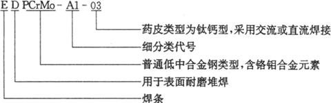 | 释义 | 我国堆焊用焊条标准概述 我国国家标准GB/T 984-2001《堆焊焊条》规定了堆焊焊条的型号分类、技术要求、试验方法及检验规则等内容,适用于手工电弧焊表面耐磨堆焊。 焊条型号根据熔敷金属的化学成分、药皮类型和焊接电流种类划分,而碳化钨管状焊条型号则根据芯部碳化钨粉的化学成分和粒度划分。 型号编制方法如下:型号中的第一字母“E”表示焊条;第二字母“D”表示用于表面耐磨堆焊;后面用一个或两个字母、元素符号表示焊条熔敷金属化学成分分类代号(见表4.2-1),还可附加一些主要成分的元素符号;在基本型号内可用数字、字母进行细分类,细分类代号也可用短划“-”与前面符号分开;型号中最后两位数字表示药皮类型和焊接电流种类,用短划“-”与前面符号分开(见表4.2-2)。 表4.2-1 熔敷金属化学成分分类(GB/T 984-2001)