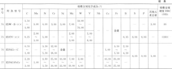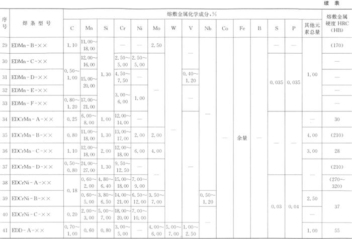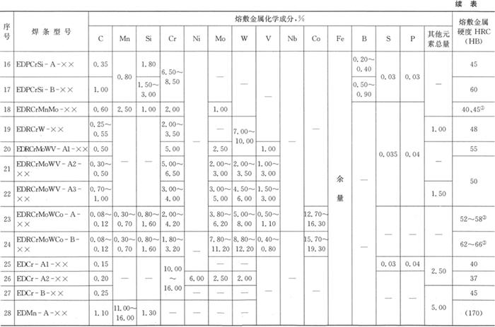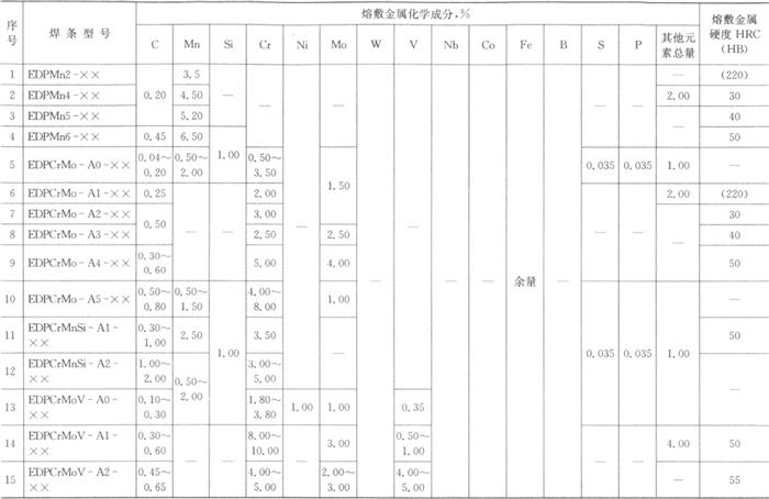 熔敷金属的化学成分和硬度应符合表4.2-5的规定。 表4.2-5 熔敷金属化学成分及硬度(GB/T 984-2001)
