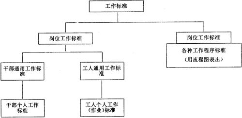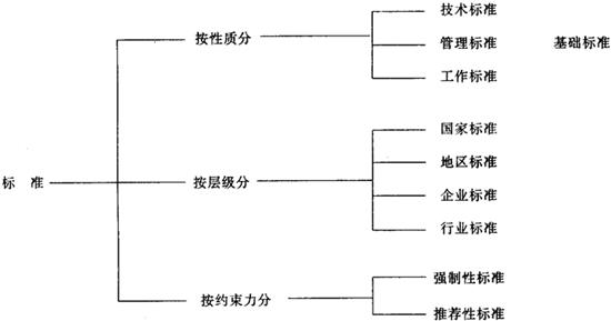 图13.1-1 标准分类图 同一标准可以分属于上述不同类别,例如常称××标准为推荐性国家标准。 2.标准的特征 标准按性质分类可分为技术标准,管理标准和工作标准,各标准的特征如下 (1)技术标准。指对技术活动中需要统一协调的事物制定的标准。 技术标准是企业进行生产技术活动的基本依据,是企业标准化体系的核心。技术标准的标准化对象主要是物质的(如产品、材料、设备),也包括非物质的(如技术规程、方法、图形、符号)。通常又细分为:基础标准、产品标准、方法标准和安全、环保与工业卫生标准。 (2)管理标准。是对标准化领域中需要协调统一的管理事项所制定的标准。 管理标准是企业管理现代化、科学化的基础;是确保产品或服务质量提高的必不可少的条件,也是企业整体素质的重要体现。 管理标准的标准化对象是事。通常又分为技术管理、生产管理、质量管理、营销管理、财务审计管理等方面的标准。 (3)工作标准。对标准化领域中需要协调统一的各类人员的工作事项所制订的标准。 工作标准是使企业职工职责分明,提高劳动效率和工作(操作)水平的基础,是保证贯彻实施技术标准和管理标准的必要条件。 工作标准的标准化对象是人,企业工作标准可分为:各类人员的岗位工作标准和工作程序标准。 3.标准体系 (1)GB/T 13016-91《标准体系表编制原则和要求》中对标准体系定义为:标准体系是一定范围内的标准按其内在联系形成的科学的有机整体。 值得注意的是:1)标准体系的组成单元是标准,不是产品;2)“一定范围”不是指标准的层级范围,而是指某一标准体系所包含的基本组成单位的范围。可以是全国、行业、企业、也可以是某项产品。例如企业标准体系中有国际标准、国家标准,也有企业自己制定的技术标准、管理标准和工作标准等;3)内在联系主要指标准体系内各标准之间的协调性和配套性。协调性是指各标准内容上必须协调一致。配套性是指体系内标准门类齐全,相互联系,相互依赖,相互制约形成一个有机整体。 (2)标准体系结构图。企业标准体系应以技术标准为主体,包括管理标准和工作标准所构成。 技术标准体系、管理标准体系和工作标准体系图如图13.1-2、图13.1-3和图13.1-4所示。