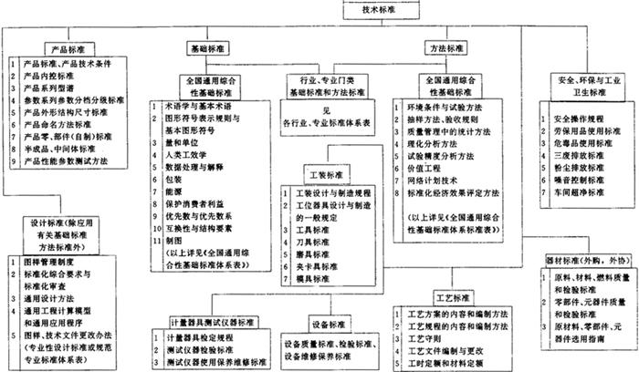 图13.1-4 工作标准体系基本组成图 上述各类标准体系结构图操作上应结合企业具体情况加以绘制。 (3)标准体系表。GB/T 13017-91中给出企业标准体系表的定义:“标准体系内的标准按一定形式排列起来的图表。” 标准体系表的组成单元是标准,不是产品。 标准体系表包括在一定时期内、一定范围的标准体系应有的全部标准,即包括应该保留的现有标准,以及应该改订、重订和修订的标准。 标准体系表内的标准,是按照一定形式排列起来的,以表示标准之间的内在联系和依存制约的关系,这种排列形式,一般表现为标准的分类组合和层次结构。其具体表现形式可以是一张表或一张结构图。主要形式为:从高到低按系统排列的层次结构。图13.1-5为全国、行业、专业标准体系表。企业应采用和贯彻表中所列的有关标准编制本企业的体系表。 全国标准体系表第一层标准 全国通用综合性基础标准体系表