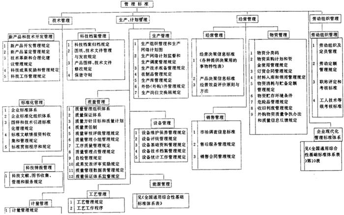 注:①本表所列项目是综合性的,不同性制裁的企业可根据具体情况列出各自应有项目。 ②与经营管理有关的其他管理事项,各企业可根据具体情况和需要自行增补。 图13.1-3 管理标准体系基本组成图