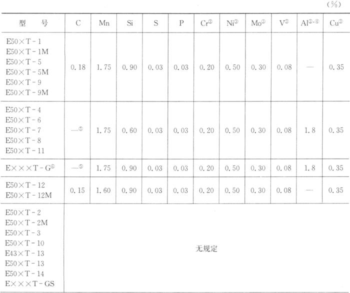 注:①应分析表中列出值的特定元素。 ②单值均为最大值。 ③这些元素如果是有意添加的,应进行分析并报出数值。 ④只适用于自保护焊丝。 ⑤该值不做规定,但应分析其数值并出示报告。 ⑥该类焊丝添加的所有元素总和不应超过5%。 表1.4-2 熔敷金属力学性能要求①(GB 10045-2001)