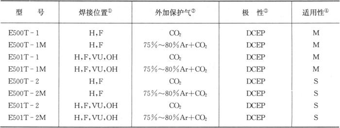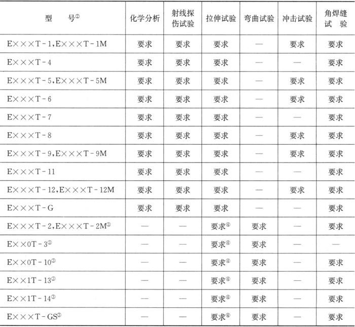 注:①对角焊缝试验,E××0T-×类焊丝应在平角焊位置进行试验,对E××1T-×类焊丝,应在立焊位置和仰焊位置进行试验。 ②对于型号带有“L”和/或“H”标记的焊丝应按表1.4-2对其进行进一步的验证试验。 ③用于单道焊接。 ④做横向拉伸试验,其他所有的型号要求进行熔敷金属拉伸试验。 |