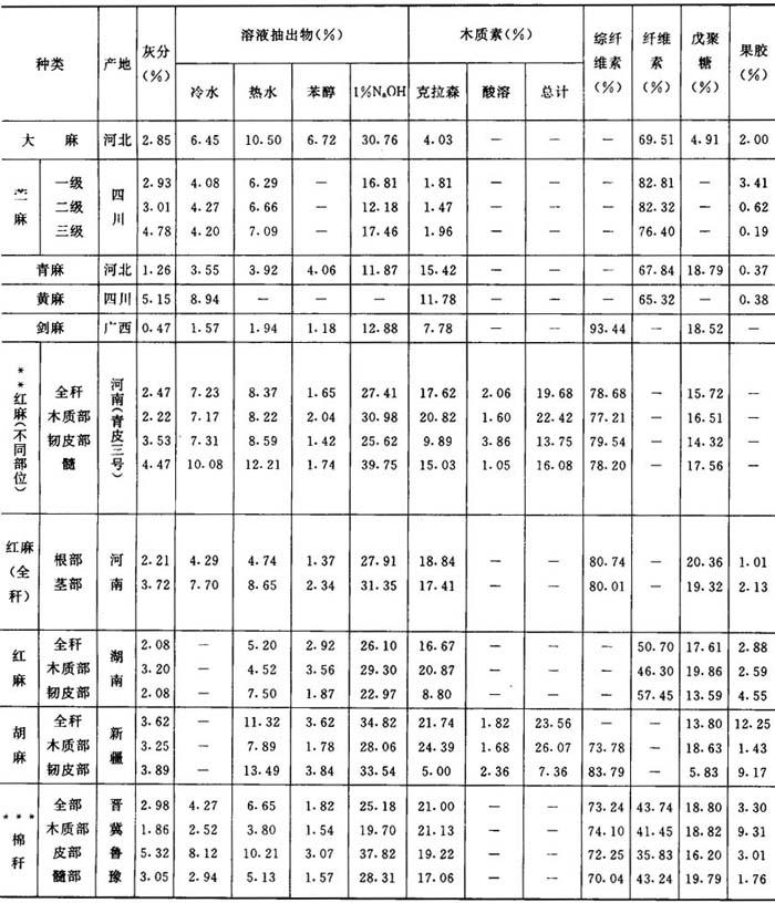 * *棉秆和麻类同属双子叶植物,因而将棉秆的分析结果也列于此表中。