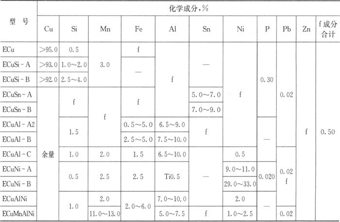 表8.2-1 铜及铜合金焊条熔敷金属的化学成分(GB/T 3670-1995)