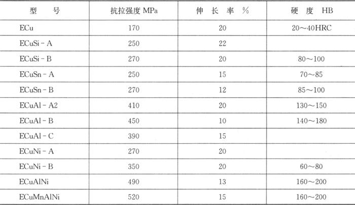 表8.2-2 铜及铜合金电焊条熔敷金属的力学性能(GB/T 3670-1995)