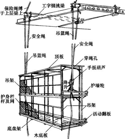 | 释义 | 手动吊篮 (一)手动吊篮的基本构造 手动吊篮构造比较简单,一般由支承设施(建筑物顶部悬挑梁或桁架)、吊篮绳索(钢丝绳或钢筋链杆)、安全钢丝绳、手扳葫芦(或倒链)和篮形架子(通常称为吊篮架体)等部分组成,如图4-32所示。