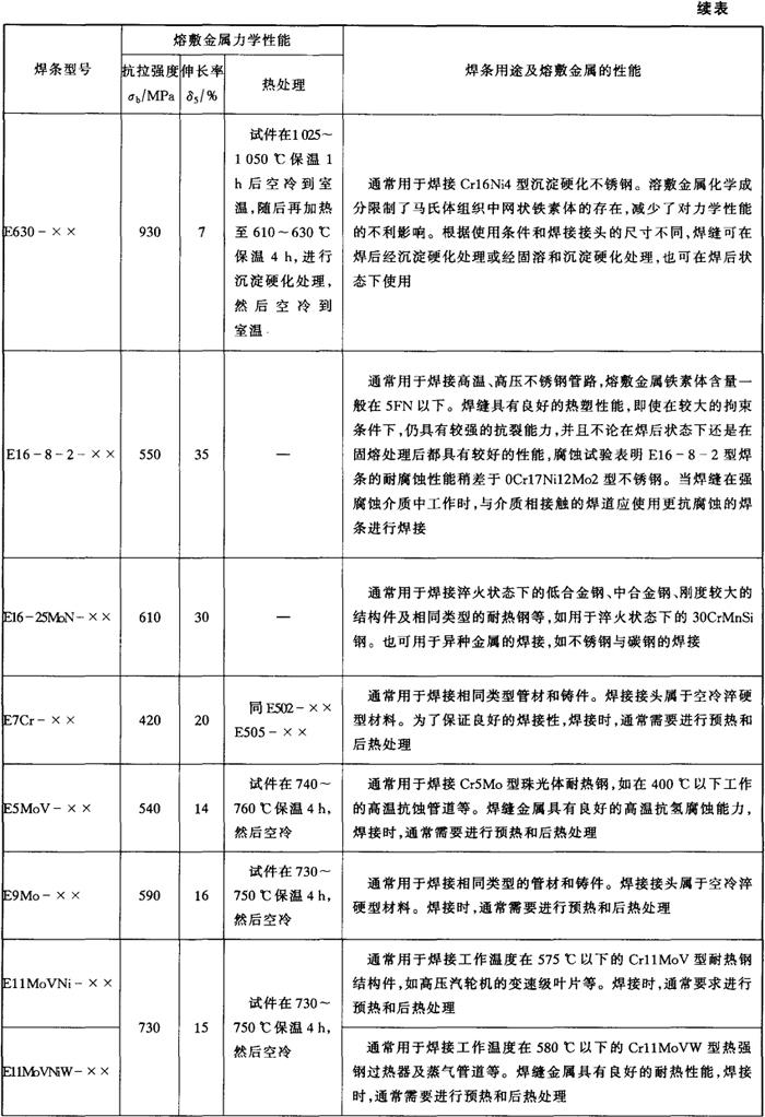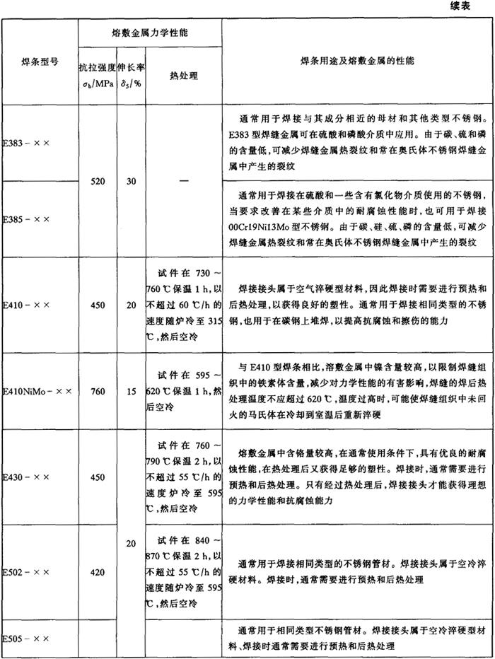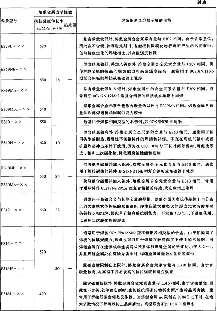 注:直径≥5.0mm的焊条不推荐全位置焊接。 各型号不锈钢焊条的力学性能和主要用途见表5-5。 表5-5 各型号不锈钢焊条的熔敷金属力学性能和主要用途