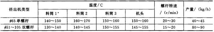 密炼料中不能有粉料或颗粒放出,若有,则需要延长密炼时间或检查设备。 (五)挤出造粒 挤出造粒可用单螺杆挤出机或双螺杆挤出机,主要控制因素为挤出温度、螺杆转速、切刀转速和粒料冷却。用干热切粒时,使粒料不粘粒,颗粒尺寸均匀,表面光滑。切刀转速调整到粒料长度为3~4mm,螺杆转速调整到粒料不粘结。SPVC电缆料挤出造粒工艺参数见表17-3。 表17-3 SPVC电缆料挤出造粒工艺参数