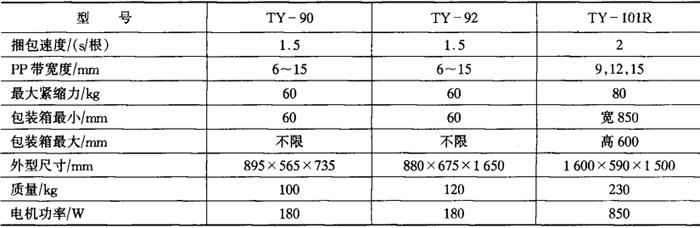 | 释义 | 捆扎机 (-)用途与特点 捆扎机是利用各种绳带将包装箱进行捆扎包装,捆扎绳带有纸带、塑料带、金属带等,目前大都使用聚丙烯(PP)带。捆扎机按自动化程度分为半自动捆扎机和自动捆扎机。捆扎机主要适应于纸箱,包装速度快,包装成本低。 (二)主要结构和工作原理 自动捆扎机一般由机架、PP带卷筒、带子进给和张紧结构、接合机标、导轨、传动机构、自动控制系统等组成。包装箱运至拱形导轨下的工作台上,捆扎机开始工作时,PP带穿过导轨绕包装箱一周,带子随即被捆紧结构抽紧,封结器、加热器将其压紧并将带子端头熔接、切断,完成捆扎作业。 (三)几种捆扎机主要技术参数 几种捆扎机主要技术参数见表4-11-2。 表4-11-2 捆扎机主要技术参数