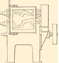 | 释义 | 捏合机 旧称“捏和机”。 利用机械搅拌使粘性或糊状物料均匀混和的设备。通常在机内的横轴上安装两把略似Z字形的刀(如图,图示倾出物料后的位置),随轴旋转,恰使一刀所卷起的物料立刻为另一刀卷下,以达到混和的目的。 此种操作称“捏合”。常用于食品、建筑材料、人造纤维等工业。