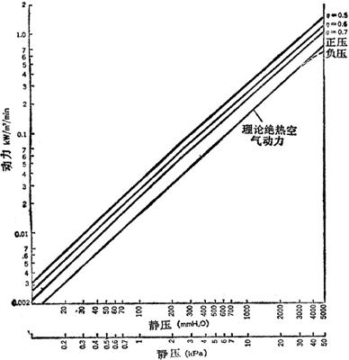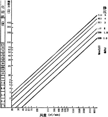 图3-70 空气1m3/min时的动力(η:送风机效率) 3.6。7 风量、静压、排风机轴动力、电动机关系 风量、静压、排风机轴动力、电动机关系见图3-71。