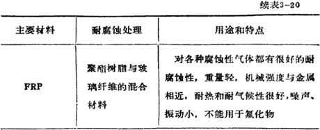 图3-72 高温运转排风机运转时的压力 温度上升时,气体体积膨胀,质量不变,密度下降。排风机的处理体积是不变的,所以,即使温度发生变化,风量基本不变。但是,压力变动与密度变化成比例,所以,温度上升,压力会下降。 看图3-72可知,取横轴的常温压力,可在纵轴上得到高温时的换算压力。另外,排风机的轴动力与(风量×压力)的结果成比例,所以,如果温度上升,则轴动力下降。 在高温下运转的排风机与风量、压力和轴动力有关,不仅如此,还应注意它的结构。如果气体中不含腐蚀性物质,其结构要求如下: 材料:温度在250℃以下时,可用普通钢;如果高于此温度,应使用不锈钢系列的材料。 轴承:温度在100℃左右,可用空气冷却轴承;超过150℃时,采用水冷轴承。另外,还应使用耐热的润滑剂。大型排风机要使用带有油冷却器的油浴器式或强制润滑式的。 3.6.9 经过耐腐蚀处理的排风机 经过耐腐蚀处理的排风机见表3-20。 表3-20 经过耐腐蚀处理的排风机