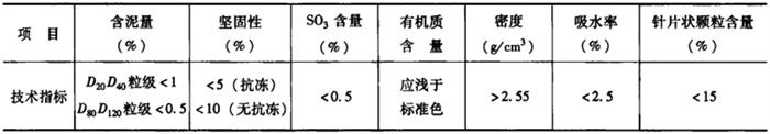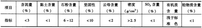 2.细集料的选择 大体积混凝土中的细集料,应符合《普通混凝土用砂质量标准及试验方法》中的规定,砂子的技术质量要求如表11-8所示。以采用优质的中、粗砂为宜,细度模数宜在2.6~2.9范围内。根据有关试验资料证明,当采用细度模数为2.79、平均粒径为0.381mm的中粗砂时,比采用细度模数为2.12、平均粒径为0.336mm的细砂,每立方米混凝土可减少水泥用量28~35kg,减少用水量20~25kg,这样就降低了混凝土的温升和减小了混凝土的收缩。 表11-8 大体积混凝土用细集料技术质量要求