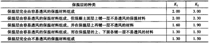 式中 δ——保温材料的厚度(m); h——混凝土结构的厚度(m); λ——保温材料的导热系数[W/(m·K)],不同保温材料的λ值见表11-9; λc——混凝土的导热系数[可取2.3W/(m·K)]; T2——混凝土的表面温度(℃); Tmax——混凝土的最高温度(℃); Tg——混凝土达到Tmax(浇筑后3~5d)时的大气平均温度(℃); K——传热系数的修正值,K值见表11-10。 表11-9 各种保温材料的导热系数λ值