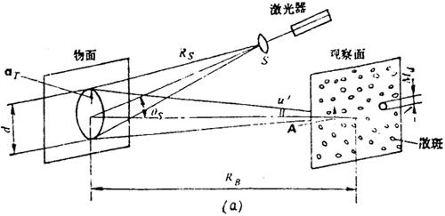 | 释义 | 散斑法 散斑计量是利用物体的散射光场在空间相干产生随机分布的散斑图样而达到计量目的的一种新技术。当用激光照射漫反射物体表面时,物体表面的漫反射光在表面附近的空间内形成随机分布的亮点与暗点,即散斑。散斑计量的特点是用普通照相的方法就可获得高灵敏度的、高分辨力的散斑图。随着散斑计量技术的发展和应用,出现了各种方法,如散斑干涉法、散斑相关法及散斑莫尔法,同时可以用电视摄象机(如CCD摄象机)来接收散斑图,直接用计算机进行处理和运算,这为非接触的精密测量开辟了又一新径。 图3.3-5是两种形成散斑的原理图,a称为衍射散斑,b称为象面散斑。衍射散斑是直接用激光照射物体,在观察面上直接接收散射光。象面散斑是由光学系统形成,即让物面的象与散斑重叠,在象面上出现散斑,它相当于全息图再现象上看到的散斑。