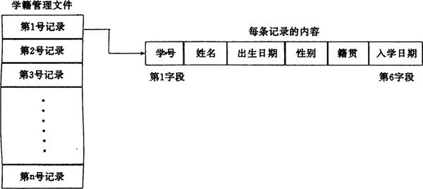 | 释义 | 文件 贮存于DATA语句中的数据,虽然也能由程序进行处理,但这种数据与程序不分的办法,受到内存容量的限制,而且数据缺乏通用性和一致性,造成管理上的很大困难。 进行事务管理时,常常把相关的数据组成一条一条的记录,然后,多个结构相同的记录存于磁盘上形成一个文件,称为数据文件。这时,再由不同的程序来处理和管理,就可以减少冗余,保证数据的通用性和一致性。 例如,一个学藉管理问题,对每一个学生要生成一个记录(Record),每一条记录又要分成若干个字段(Field),其组成形式有如下图: