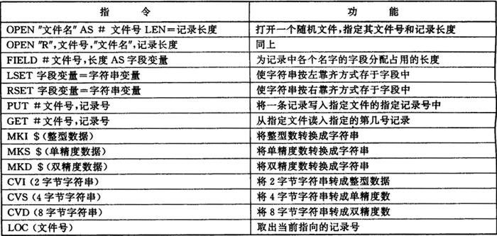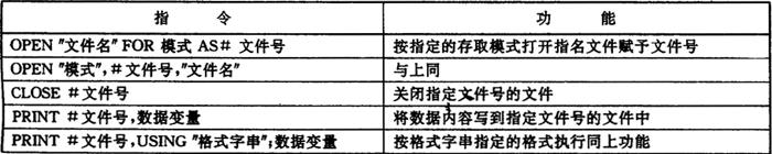 使用顺序文件的步骤如下: (1)使用OPEN语句,将文件名与文件号联系起来,其中存取模式这一项,可以选用如下三种之一: ①OUTPUT——输出型文件,用于向磁盘写出数据。 ②INPUT——输入型文件,打开磁盘文件用于读入数据。 ③APPEND——追加型文件,写出数据追加在原有文件的尾后。 如果没有特殊说明,一个程序可同时打开三个文件。 (2)在继后的语句,可以使用PRINT#、PRINT#USING、INPUT#等语句,实施对文件的写读。 (3)写、读完毕,应该用CLOSE#语句关闭文件。 2.随机文件 对随机文件的操作指令表