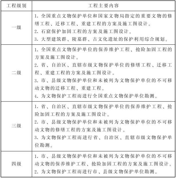 | 释义 | 文物保护工程勘察设计资质管理办法(试行) 一 总 则 第一条 为加强文物保护工程勘察设计资质管理,根据《文物保护工程管理办法》,结合文物保护工程的具体情况,制定本办法。 第二条 从事核定为文物保护单位和其它具有文物价值的古文化遗址、古墓葬、古建筑、石窟寺和石刻、近现代重要史迹及代表性建筑、壁画等文物保护工程勘察设计的单位资质管理,适用本办法。 第三条 文物保护工程勘察设计是指为文物保护工程而进行的调查、研究、测绘、制定保护方案、工程设计及技术经济分析,编制保护规划,并提供勘察成果资料、设计文件或规划文本的活动。 第四条 凡从事文物保护工程勘察设计的单位,必须按照本办法申请并取得《文物保护工程勘察设计资质证书》,方可承担相应等级和业务范围的文物保护工程。 第五条 国家文物局负责审定、颁发《文物保护工程勘察设计资质证书》和资质年检工作。省、自治区、直辖市文物行政部门负责资质初审和日常管理工作。 资质申报、审定工作每三年一次;年检每年一次。 二 资质等级与标准 第六条 文物保护工程勘察设计资质分为综合资质和专项资质。专项资质适用于保护规划以及壁画、石质文物等有特殊专业技术要求的保护工程。 综合资质等级分为甲、乙、丙三级和暂定级。专项资质不分级。 第七条 甲级资质标准: 一、经主管机关核准登记的企、事业单位,从事文物保护勘察设计业务十年以上,独立承担过不少于十项、工程等级为一级,或者不少于十五项、工程等级为二级及以上的文物保护工程项目的勘察设计,其工程已经竣工,质量合格。 二、法定代表人与技术人员均有较强的文物保护意识,单位总体水平在国内同行业领先,有较高的社会信誉,参加过或有能力参加文物保护工程的规范、规程、标准、定额的编制工作。 三、单位中专职固定且取得国家文物保护工程勘察设计职业资格证书的技术人员总数不少于20人,其中有相关专业高级技术职称的技术骨干不少于8人(应聘并固定在该单位的离退休技术人员不超过20%)。 四、有健全的技术、管理制度和全面质量管理体系。 五、具有与其资质相适应的专业技术装备。 六、注册资金不少于100万元。 第八条 乙级资质标准: 一、经主管机关核准登记的企、事业单位,从事文物保护勘察设计业务五年以上,独立承担过不少于五项、工程等级为二级,或者不少于十项、工程等级为三级及以上的文物保护工程项目的勘察设计,且工程已经竣工,质量合格。 二、法定代表人与技术人员均有较强的文物保护意识,单位总体水平在所在省、自治区、直辖市同行业领先,有较高的社会信誉。 三、单位中专职固定且取得国家文物保护工程勘察设计职业资格证书的技术人员总数不少于15人,其中有相关专业高级技术职称的技术骨干不少于6人(应聘并固定在该单位的离退休技术人员不超过20%)。 四、有较健全的技术、管理制度和全面质量管理体系。 五、具有与其资质相适应的专业技术装备。 六、注册资金不少于70万元。 第九条 丙级资质标准: 一、经主管机关核准登记的企、事业单位,独立承担过不少于五项、工程等级为三级,或者不少于十项、工程等级为四级及以上的文物保护工程项目的勘察设计,其工程已经竣工,质量合格。 二、法定代表人及主要技术人员有正确的文物保护意识,所完成项目得到国家和省、自治区、直辖市文物行政管理部门认可。 三、单位中专职固定且取得国家文物保护工程勘察设计职业资格证书的技术人员总数不少于10人,其中有相关专业高级技术职称的技术骨干不少于3人(应聘并固定在该单位的离退休工程技术人员不超过20%)。 四、有较健全的技术、经营、质量、档案、财务管理制度。 五、具有与其资质相适应的专业技术装备。 六、注册资金不少于50万元。 第十条 暂定级资质标准: 资质条件不低于丙级。 第十一条 取得保护规划以及壁画、石质文物保护等有特殊专业技术要求的勘察设计资质,除应具备上述相应的资质条件以外,还应具有掌握相关特殊技术的专业人员和必要装备。 第十二条 申请国家文物保护工程勘察设计职业资格证书的人员,必须具有相关专业中级以上技术职称,从事文物保护工程勘察设计三年以上,并经培训、考核合格。 三 资质申请和审批 第十三条 申请《文物保护工程勘察设计资质证书》的单位,须向所在地省、自治区、直辖市文物行政部门提出申请。省、自治区、直辖市文物行政部门初审、汇总后,报国家文物局审批。 第十四条 申请《文物保护工程勘察设计资质证书》,应提供下列资料: 一、文物保护工程勘察设计资质申请表; 二、主管机关颁发的企、事业单位证书或文件; 三、法定代表人和技术人员简历、职业资格证书、职称证书、学历证书、身份证复印件; 四、技术骨干的职称证书、职业资格证书、学历证书、身份证复印件; 五、完成的具有代表性文物保护工程的勘察设计合同及验收评估资料; 六、审批机关认为必须的其他相关证件、资料。 第十五条 文物保护工程勘察设计单位取得正式资质并从事勘察设计满三年后,可提出升级申请。 申请资质升级,除提供本办法第十四条所列资料外,还应提供下列资料: 一、原资质证书正、副本; 二、原资质等级历年财务决算年报表。 第十六条 