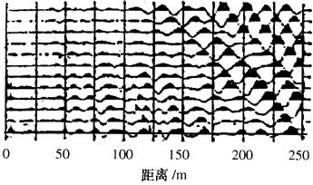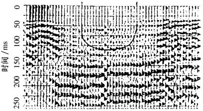 b陷落柱上的炮点记录 图4-21 炮点记录 (2)COP剖面(共偏移距剖面):从图4-22中不难看出,COP剖面上在0~130ms的记录段内,地震波形有明显的变化,形成一空白带,而这个空白带正对应着地下的陷落柱。