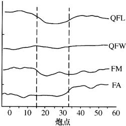 图4-22 SS11线COP剖面(第三道) (3)地震多元参数曲线:在COP道集基础上,进行地震参数提取,图4-23给出了第11道的频域参数曲线。根据提取的四个参数来分析,FA较FM能准确地反映变化的情况,进行先取FA作为主要依据,FM、QFL、QFW作为参数来进行综合评判。按照陷落柱的地质成因来推断,地震波在陷落柱内的吸收作用增强,频率应该降低,即频率曲线在陷落柱上应该是低值区,这和图中虚线标出的陷落柱范围内的曲线响应是吻合的。