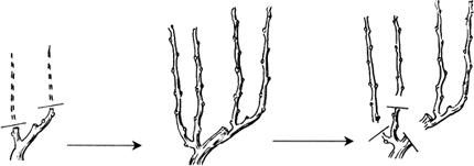 图25 单枝更新 (2)双枝更新 冬季修剪时在每个结果母枝上都留2个靠近老蔓的充分成熟的1年生枝,上面一个适当长留,作来年的结果母枝,下面一个短留用做预备枝。下年冬剪时将上部结果部位疏除,从下部预备枝上所抽生的枝梢中选近基部的2个枝梢,其中上面1枝做下一年的结果母枝长留,下1枝做预备枝短留,每年均照此法修剪(图26)。