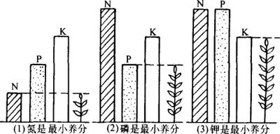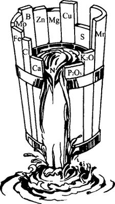 图4-1 李比西的最小养分律法则 最小养分律在施肥实践中提醒人们应根据土壤有效养分含量和作物需肥特性,首先施用含最小养分的那种肥料,当发生最小养分转变,新的最小养分出现时,施肥目的随之转变到解除新的最小养分限制作用上来。因而在实际施肥过程中,要运行各种肥料的合理配比,使各种养分因子协调平衡以满足作物需要(图4-2)。