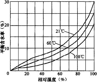 图9-2 木材的纤维饱和点 3.平衡含水率 潮湿的木材会向较干燥的空气中蒸发水分,干燥的木材也会从潮湿空气中吸收水分,当木材长期处于一定温度和湿度的空气中,当木材中的含水率与周围空气中的相对湿度达到平衡时,称为木材的平衡含水率。 木材平衡含水率与大气的温度和相对湿度有关,将随着周围空气的温湿度的变化而变化,如图9-3所示。新伐木材的含水率一般在35%以上,风干木材的含水率在15%~25%之间,室内干燥的木材含水率在8%~15%之间。