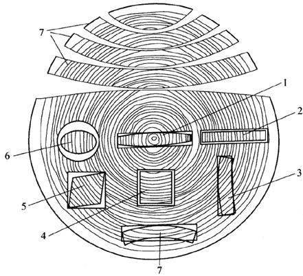图9-6 木材干燥后截面形状的改变 1-含髓心径锯板,呈凸形;2-不含髓心径切板,干缩均匀;3-端面与年轮成45°板,呈瓦状翘曲;4-板迹与年轮平行,正方形变为长方形;5-与年轮呈对角线,正方形变为菱形;6-与年轮平行,圆形变为椭圆形;7-弦锯板呈弯瓦翘曲
