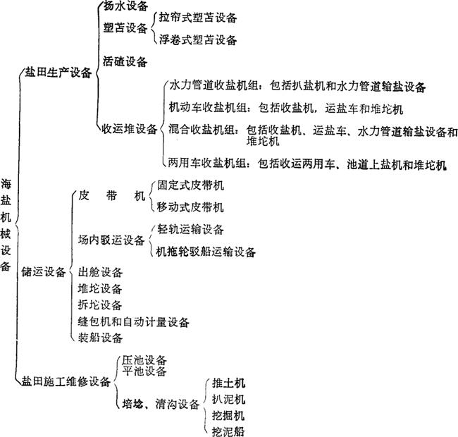 海盐机械设备包括从纳潮到原盐销售整个过程中所使用的主要机械设备,按工序分类如下: