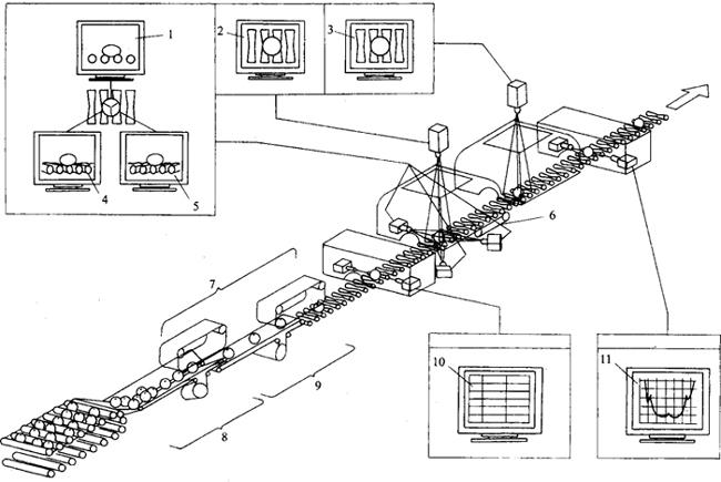 图6-2 图像处理式分级过程 1-左侧尺寸品质等级摄像机 2-上方尺寸品质等级摄像机 3-下方尺寸等级摄像机 4-右方品质等级摄像机 5-右前品质等级摄像机 6-翻转皮带 7-果实压紧带 8-V型排列装置 9-F形分离装置 10-糖酸度检测传感器 11-皱皮检测装置 |
