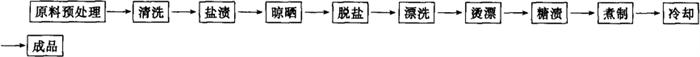 图1-6-14 果脯类糖渍制品加工工艺流程图 (1)原料预选 通常以鲜果为原料,因为在加工过程中需要较长时间煮制、腌渍拌匀等,果品易破碎。为保持产品外形完整,减少破损损失,需选择肉质致密、坚实的果实作原料。 对于北方水果,如苹果、桃、杏、枣等原料,要求选择成熟度在7~8成。南方水果,如金橘、菠萝,要求选择成熟度在8~9成。而蔬菜类原料,如胡萝卜、冬瓜及藕则没有严格要求,成熟即可。 (2)原料预处理 果蔬原料种类较多,各种原料形状、质地不同,预处理工艺也不尽相同。如苹果要清洗,去皮,分辨,去核,放在0.2%~0.3%的亚硫酸盐溶液中浸泡;枣要分级,清洗,去核,划丝,再熏硫或放在亚硫酸盐溶液中浸泡。蔬菜则需拣选,清洗,去皮,切块(条、片)及硬化处理,浸硫即可。原料预处理所用机械大致有清洗机、去皮机、切片机、捅核机及浸泡槽等。目前国内生产厂家预处理工序完全采用机械化生产的不多,主要以手工和半机械化生产方式为主。 (3)煮制 果实在未加热前,保持原有活性,由于细胞膜的选择性渗透作用,以及细胞内胶体物质特性,保持了一定的膨胀压,当其与糖液一同加热时,由于细胞膜内外存在着渗透压的差异,使细胞内的水分向外扩散引起细胞缺水收缩。由于细胞膜对内外通过的物质具有一定的选择性,糖液中的糖分子扩散较慢。在煮制过程中,果实组织细胞受到高温作用,胶体物质发生变化,细胞膜选择性的控制能力被破坏。这样,水分子和糖分子交换就没有障碍了。因而,扩散运动的速率大大加快。糖液中的糖分子与原料组织中的水、空气分子置换得较为充分。即浸糖效果好,外形饱满、透明。煮制时间不易过长,一般因原料不同而有差异,多数在2~10min内,糖液浓度一般不高于30度(折光计浓度)。 煮制设备多采用夹层锅或浸渍罐。用浸渍罐加热煮制时,可不用真空装置。 (4)真空浸渍 经过煮制后原料放在真空浸渍罐中,然后将调配好的糖液抽入罐中,开启真空装置,进行真空浸渍。抽真空时间一般为5~30min,真空度保持在80~90kPa,最高不得超过95kPa。质地较软且疏松的原料,抽真空时间一般在5~10min,真空度在85kPa,这样容易保证原料外形整齐,破损率较低。浸糖的浓度最高不超过75度(折光计)。此道工序采用真空浸糖罐。 (5)烘干 将浸渍好的原料沥糖后,放在托盘上进行烘烤。烘干室的温度及烘烤时间随原料品种不同而有差异。如苹果烘烤温度在65~75℃,要逐步升温,达到规定的温度后,保温时间为18~36h。杏脯一般要烘烤2次,第一次烘制温度为60~65℃,时间为8~12h;第二次定型烘干温度为70~85℃,时间为1~2h。烘烤工序原则是块大、肉厚、完整的原料,烘制温度要适当低一点,持续时间要长,排湿要充分。切忌升温过快,温度过高。否则,易造成原料外部水分损失过快,表面硬化,并出现收缩起皱,而严重抑制其内部水分的溢出,反而大大延长烘烤时间,造成产品不易保存、霉烂。 实践证明,采用烘房烘制果脯比烘干机效果好得多。因而,目前各厂家广泛采用烘房烘烤果脯。 (6)冷却,整形,包装 烘烤后的果脯要经过强制冷却,防止吸潮,然后在一定时间内进行回软处理,时间为8~12h。 回软后进行整形处理,整形是将果脯按原有的物料形状进行修边,压平,使之外形美观。 包装形式分纸箱及小袋包装两种,一般纸箱包装先将果脯放入大塑料袋中,然后再装入纸箱中。小袋一般采用复合袋包装。包装好的成品入库保存,成品库要控制在25℃以下,相对湿度在60%以下,并做好防尘、防霉、防虫及防鼠工作。 2.2 蜜饯类糖渍制品加工工艺 蜜饯类糖渍制品,一般采用一次煮成法和冷浸法。生产过程较果脯生产简单,其主要工序集中在原料前处理阶段,所需设备也较果脯少得多。主要设备有打孔机、去核机、分辨机等。 蜜饯类糖渍制品加工工艺流程如图1-6-15所示。