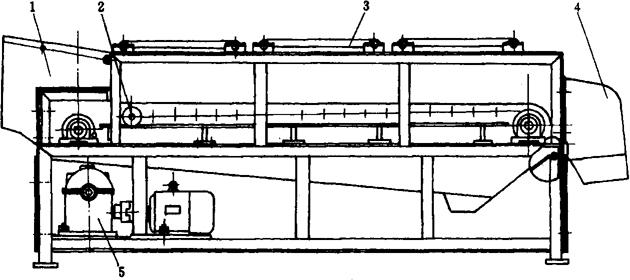 图1-6-17 水果淋洗机 1-进料斗 2-滚动输送机构 3-喷淋系统 4-出料斗 5-传动机构 清洗后的果蔬经过熏硫及浸硫处理后需经淋洗机进行再清洗,使表面残留物除掉。另外,淋洗机也可清洗汁多、皮薄的水果。该机工作时原料由进料斗1进入滚动输送机构2中。滚动输送机构是由多个倒锥串滚组成,倒锥串滚固定在输送链条上,可随输送链条前进,物料进入输送机构中可实现两种运动,既自身翻滚又可随输送机构向前运动。这样,在喷淋系统喷淋水的喷刷下,将原料表面残余物质清洗干净,从出料斗4送出。 3.3 切条机(图1-6-18)